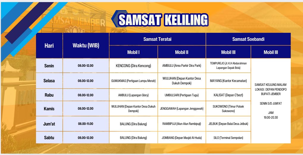 Dengan adanya Samsat Keliling, membayar pajak kendaraan kini menjadi lebih mudah dan nyaman. Manfaatkan layanan ini untuk menjadi warga negara yang taat pajak dan turut berkontribusi pada pembangunan daerah.